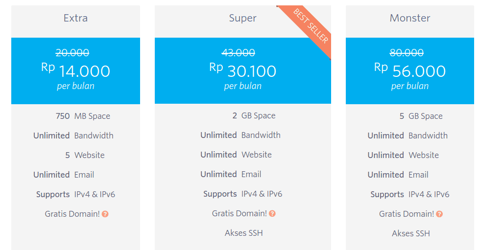 Harga Shared Hosting bervariasi tergantung kualitas, saya akan menggunakan harga dari DomaiNesia, yaitu berkisar antara Rp.168.000 – Rp.672.000 / tahun.