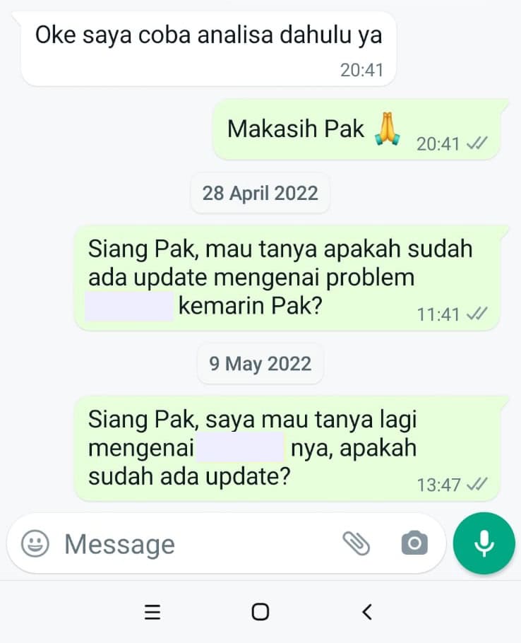 Tidak lama setelah itu si penyedia jasa kembali hilang selama berbulan-bulan sewaktu saya membutuhkan bantuan.