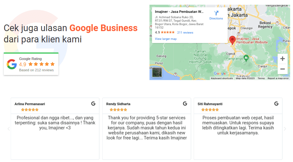Misalnya review dari Google Business lebih meyakinkan bagi pengunjung dibandingkan review berupa tulisan biasa pada website. Review website dapat dikontrol (diedit dan dimanipulasi) oleh pemilik website, sedangkan Google Review terbuka untuk umum (lebih sulit untuk dimanipulasi).