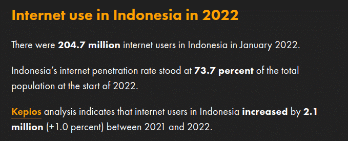Jumlah pengguna internet di Indonesia di tahun 2022 mencapai 73.7%.