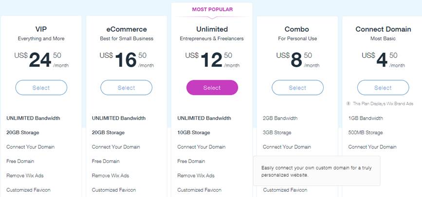 Anda dapat menghilangkan iklan Wix dan menggunakan domain sendiri dengan biaya $8.50 / bulan.