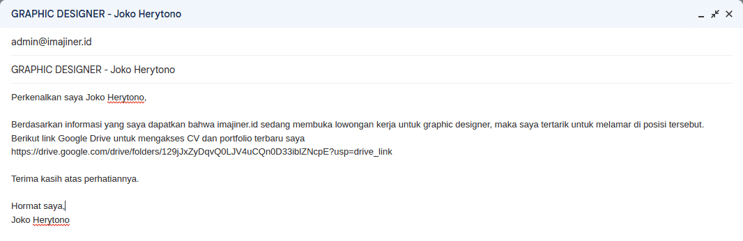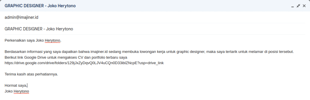- Cantumkan link Google Drive yang berisi CV dan portfolio dalam body email
